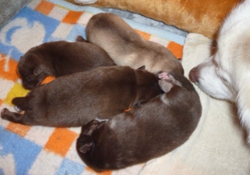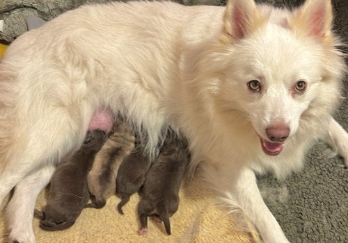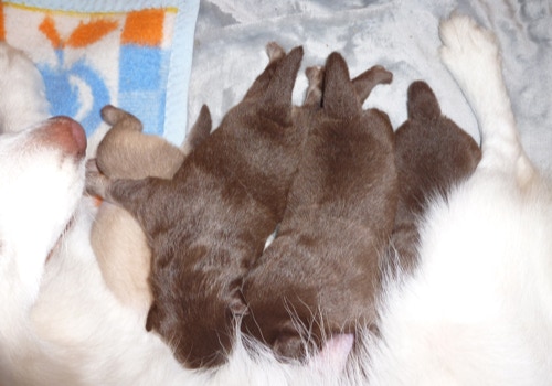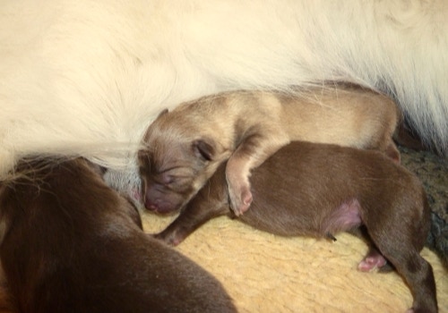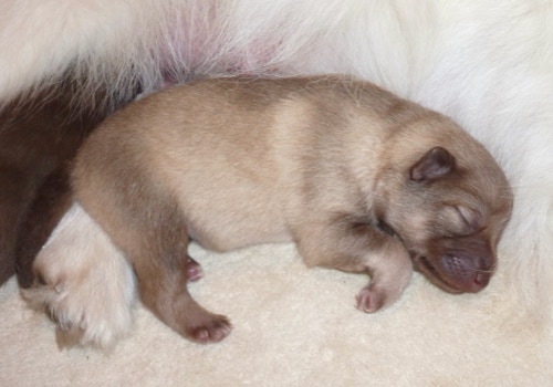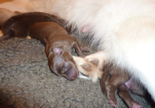 Unsere kleinste Maus aus dem Wurf hat als erstes ihre Augen geöffnet, die anderen haben gegen Ende der 2.Woche dann auch angefangen ihre zu öffnen. Henny versorgt die Lütten so instinktsicher und entspannt, sie lässt sich kaum aus der Ruhe bringen. Kayli hat beim Einschlafen so ihre Meckerphasen, sie braucht immer eine Weile bis sie das für sie passende Plätzchen gefunden hat und derweil fiepst sie immer, Henny ignoriert es einfach, hat aber immer ein wachsames Auge auf sie bis sie zur Ruhe gekommen ist. Kimay knurrt öfters mal, besonders wenn er tief schläft, Keelin und Kundri sind kaum zu hören, es sei denn es geht um die Milchquelle, da kann Keelin schon mal laut werden, besonders, wenn die Milch ihrer Meinung nach nicht schnell genug fließt .
