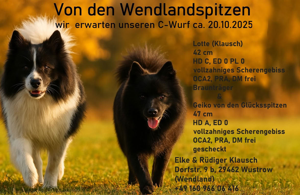Unser Riko hat bei den Wendlandspitzen Vollgeschwisterchen bekommen. Am 19.10.2025 wurde der C-Wurf bei Elke und Rüdiger Klausch geworfen. 1 Rüde in schwarz und 2 Rüden in braun suchen noch ihre Familien. Bei Interesse bitte bei Familie Klausch melden.