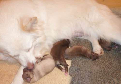 Unsere kleinste Maus aus dem Wurf hat als erstes ihre Augen geöffnet, die anderen haben gegen Ende der 2.Woche dann auch angefangen ihre zu öffnen. Henny versorgt die Lütten so instinktsicher und entspannt, sie lässt sich kaum aus der Ruhe bringen. Kayli hat beim Einschlafen so ihre Meckerphasen, sie braucht immer eine Weile bis sie das für sie passende Plätzchen gefunden hat und derweil fiepst sie immer, Henny ignoriert es einfach, hat aber immer ein wachsames Auge auf sie bis sie zur Ruhe gekommen ist. Kimay knurrt öfters mal, besonders wenn er tief schläft, Keelin und Kundri sind kaum zu hören, es sei denn es geht um die Milchquelle, da kann Keelin schon mal laut werden, besonders, wenn die Milch ihrer Meinung nach nicht schnell genug fließt .