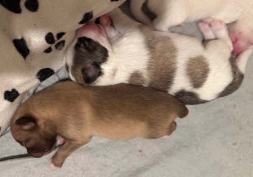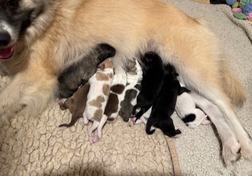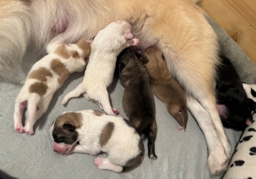 So bunt in einem Wurf, das hatten wir noch nicht. Nach 2 Tagen Vor- und Senkwehen, hat Lana ihren Wurf innerhalb von 6 Stunden geworfen, immer mit Schlafphasen dazwischen, ausser bei Nr. 3, 4 und 5, die kamen innerhalb von 20 Minuten.