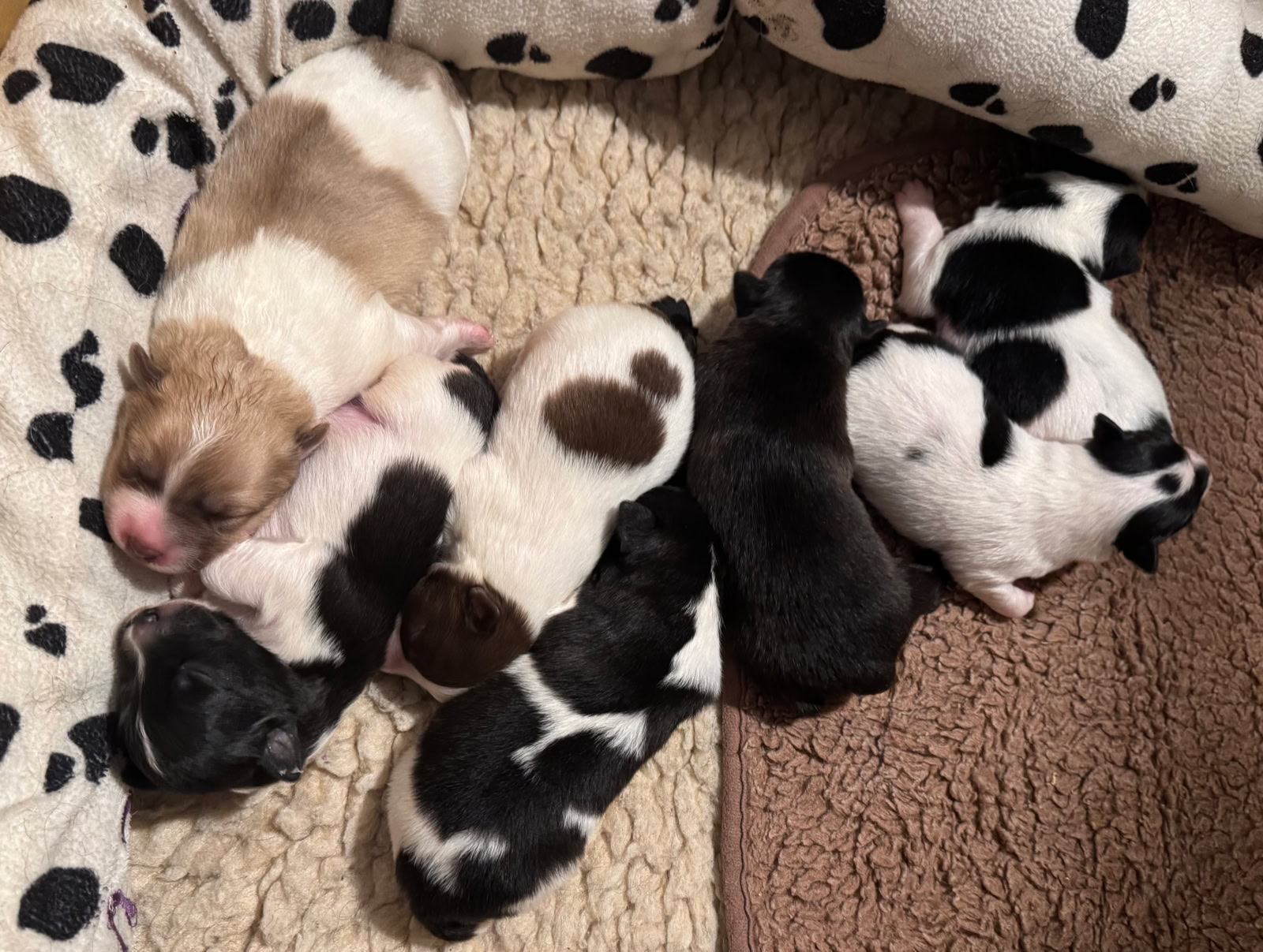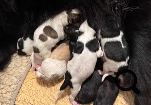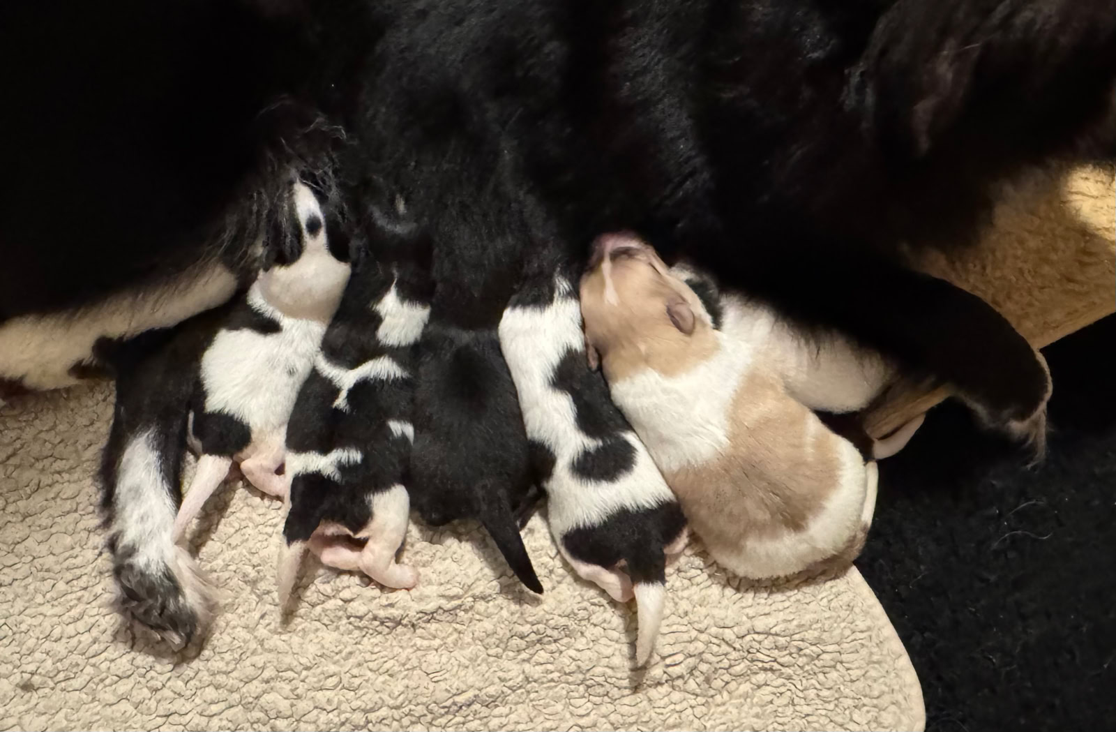 Am 27.11.2025 kam unser N-Wurf zur Welt, leider war es keine unkomplizierte Geburt, von 10 Welpen haben es 3 nicht überlebt (einer kam tot zur Welt und 2 weitere starben, als extreme Frühchen waren ihre Aussichten von Anfang ungewiß). Für Mama Jadea, zum ersten Mal Mama, war es belastend zu sehen, wie trotz ihrer und unserer intensiven Bemühungen, die beiden Lütten eingeschlafen sind. Sie haben gekämpft und auch zugenommen, aber es sollte einfach nicht sein :-(.