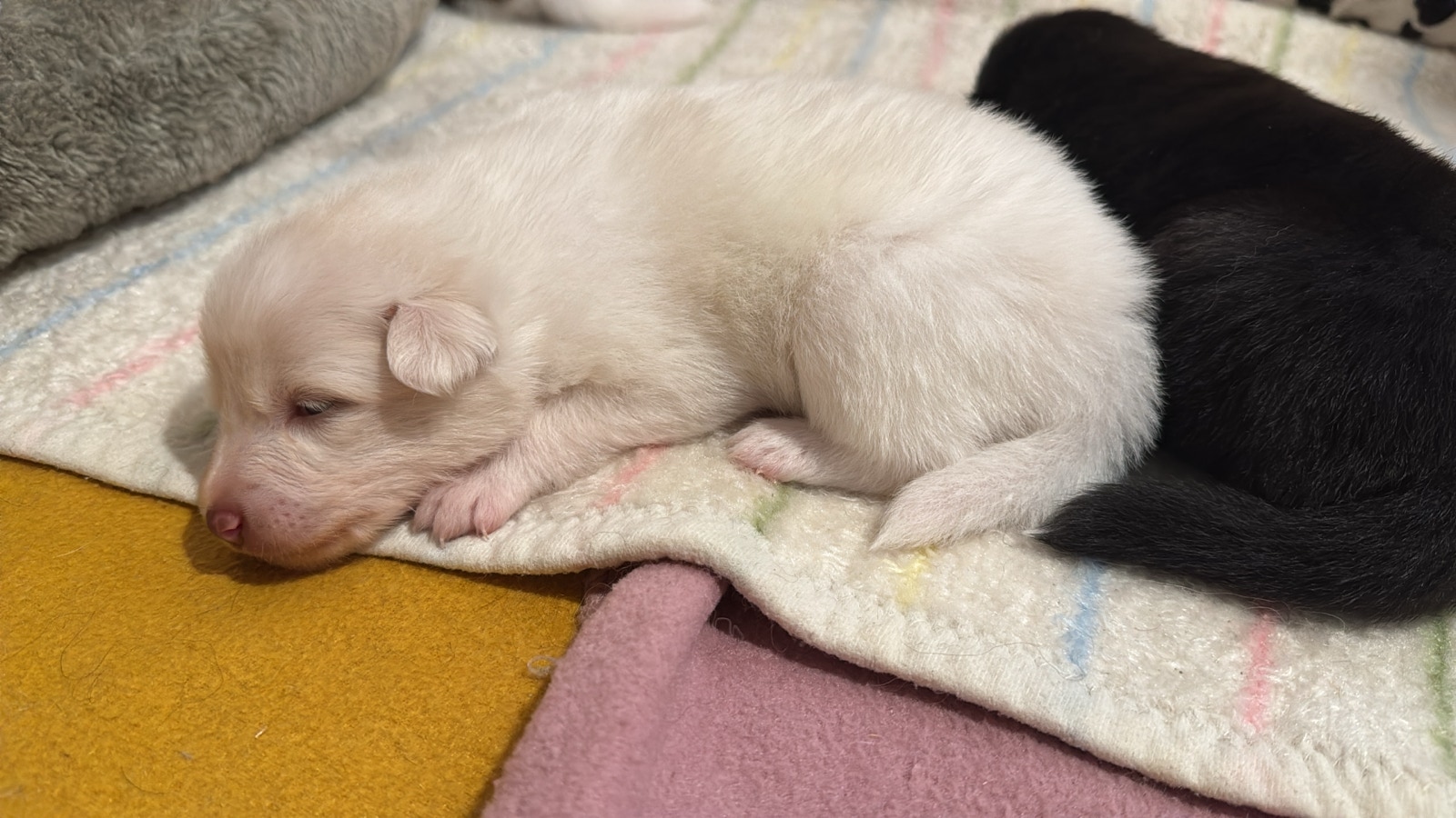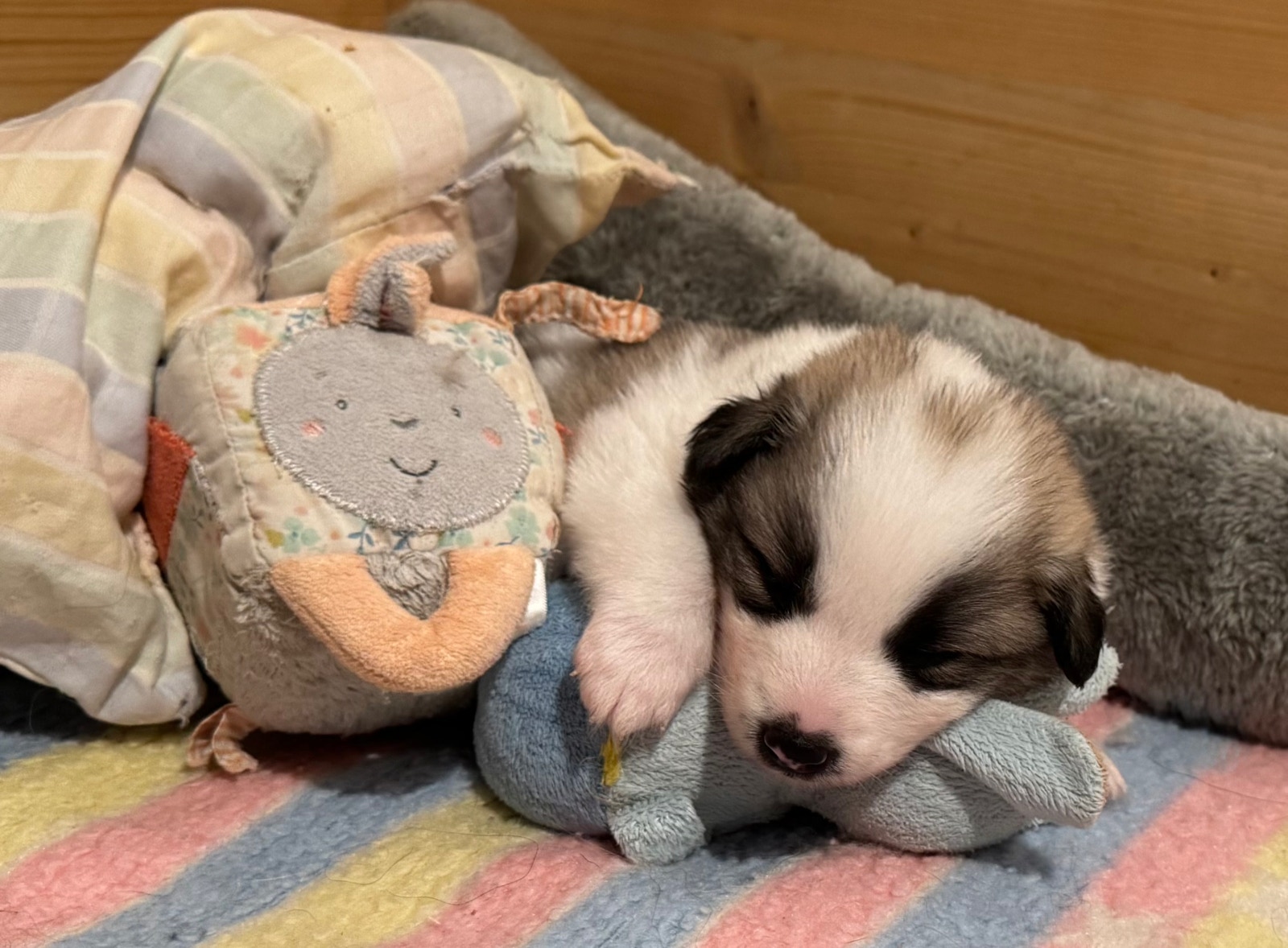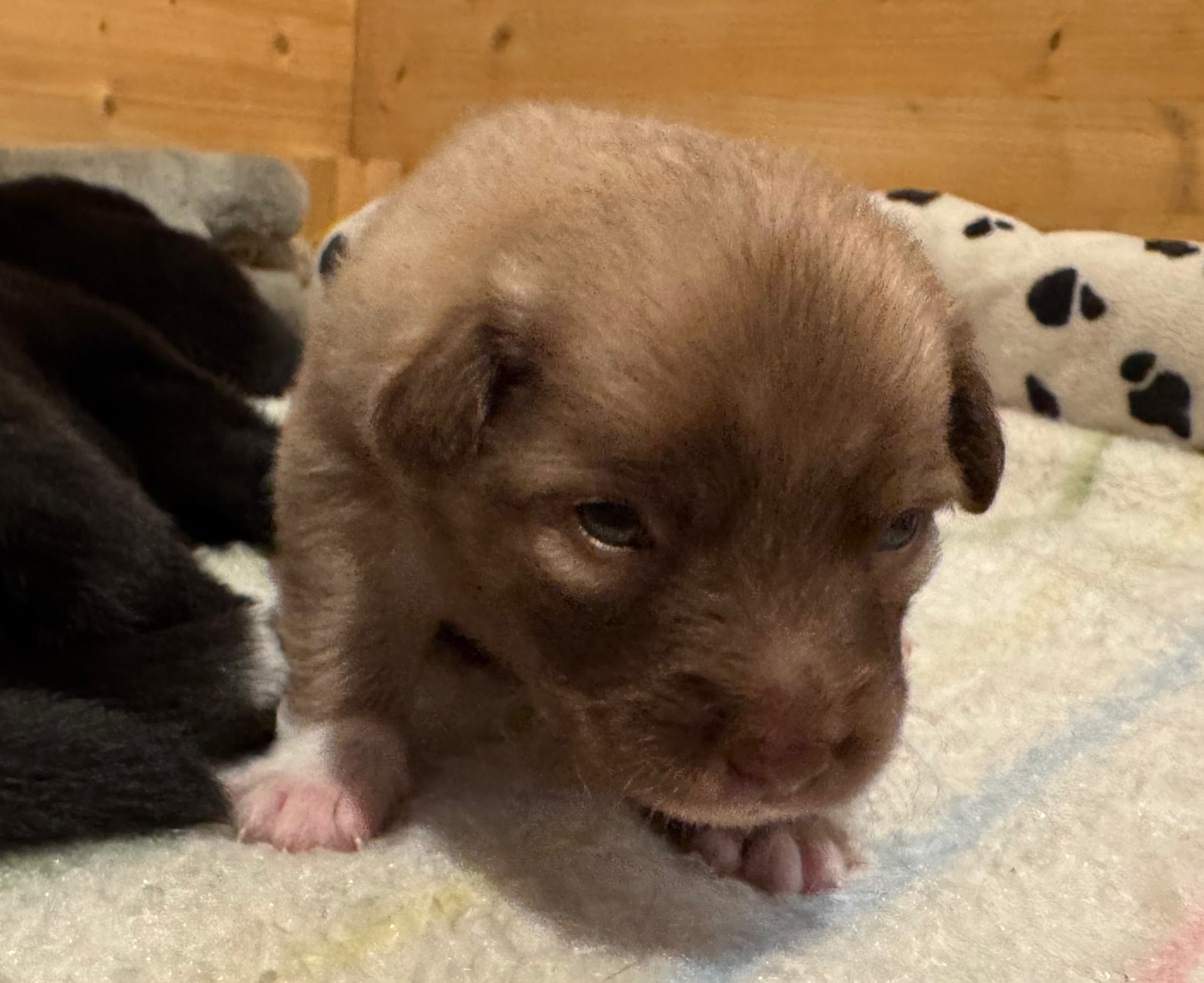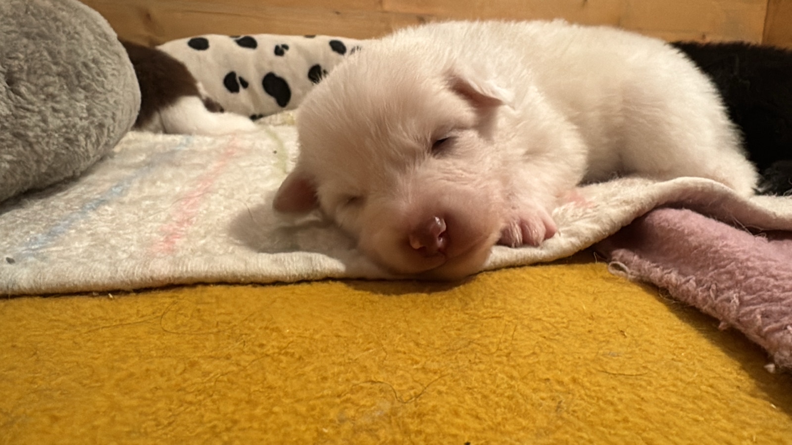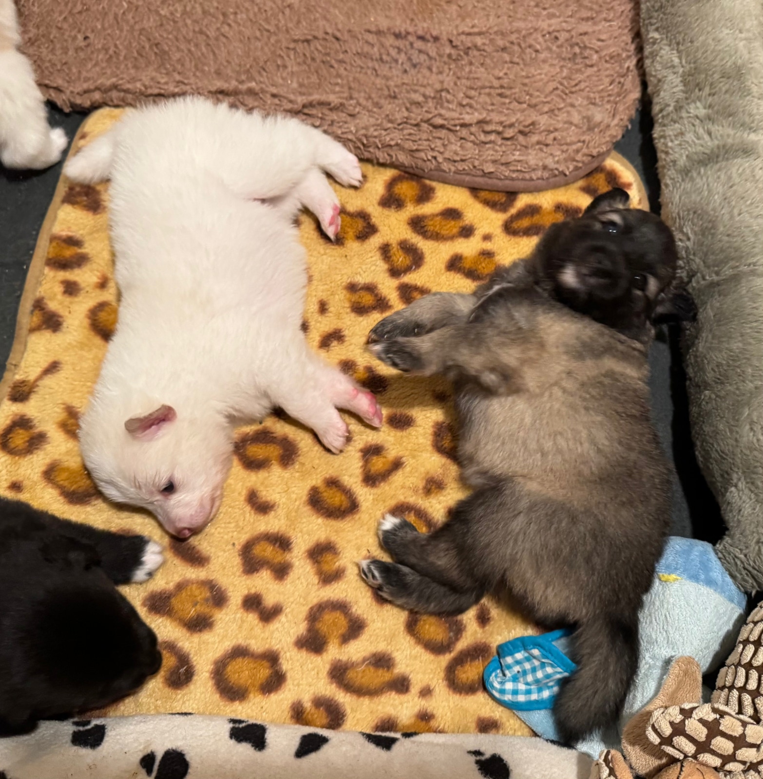 Nun sind unsere Neune schon in der 4. Woche und haben ihre erste Wurmkur gut hinter sich gebracht. Jeden Tag gibt es längere Wachphasen, in denen gespielt, agiert oder beobachtet wird und sie sind alle sehr am Menschen interessiert. Sobald sie mit bekommen, das wir sie beobachten oder sie uns hören oder riechen, wollen sie sofort geknuddelt werden und die Ruten werden zu Propellern. Maja springt dann sogar vorwärts, nur um als eine der ersten ganz vorne dabei zu sein, auch sonst ist sie sehr kommunikativ, sie weiß wie sie auf sich aufmerksam machen muss. Es zeigen sich auch die ersten Charakterzüge, wer eher ruhiger und besonnen reagiert oder temperamentvoll nach vorne stürmt, wobei das meist hochkant am Welpengitter oder den Wänden der Wurfkiste endet, das Gemecker danach ist auch nicht zu verachten. Aber noch sind sie einfach bezaubernd und mit ihrem Laut Repertoire einfach lustig, gerade abends sind sie länger munter und dann herrscht ein Fiepen, Bellen, Knurren, Geknöttere und Julen, dass sogar Mama meist das Weite sucht und nur aus der Ferne ihre Bande beobachtet. Ansonsten kümmert sie sich liebevoll und gewissenhaft um ihre Rangen, auch wenn wir nun futtertechnisch unterstützen, denn bei nur 8 Zitzen und 9 Welpen wird es zunehmend schwierig alle ausreichend satt zu bekommen. Aber die Lütten sind da sehr kooperativ, der Milch-Futterbrei wird gerne angenommen und Mama bekommt sogar manchmal noch Reste. Auf jeden Fall ist nach den Mahlzeiten bei ihren Lütten Großreinigung angesagt, denn mit dem „ordentlichen“ Futtern wird es noch etwas dauern, dafür fehlt es nicht am Einsatz und mitten drin macht ja auch satt :-).
