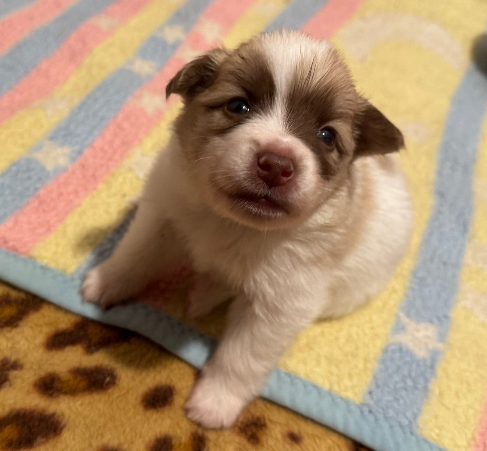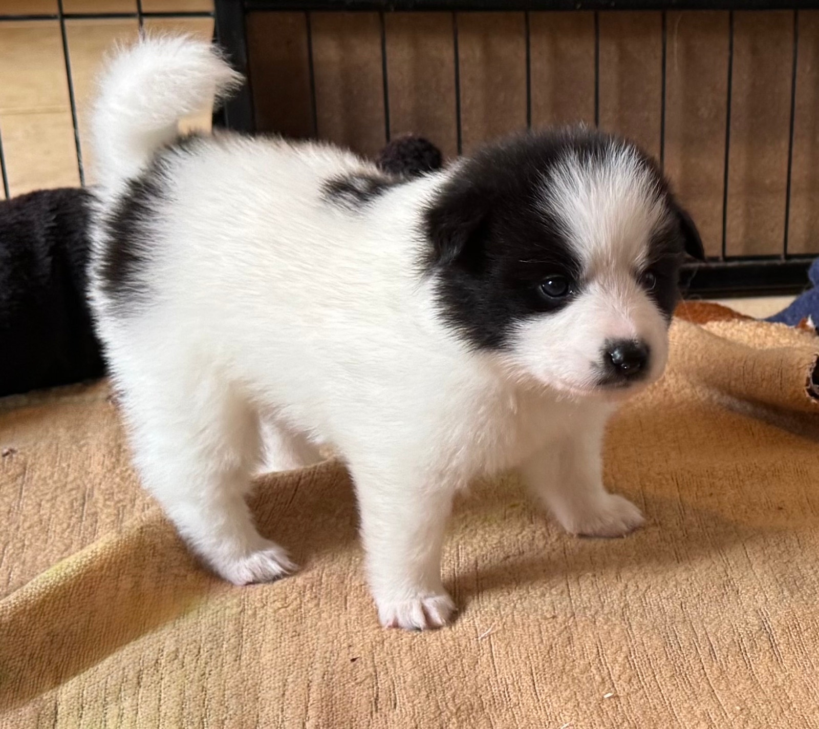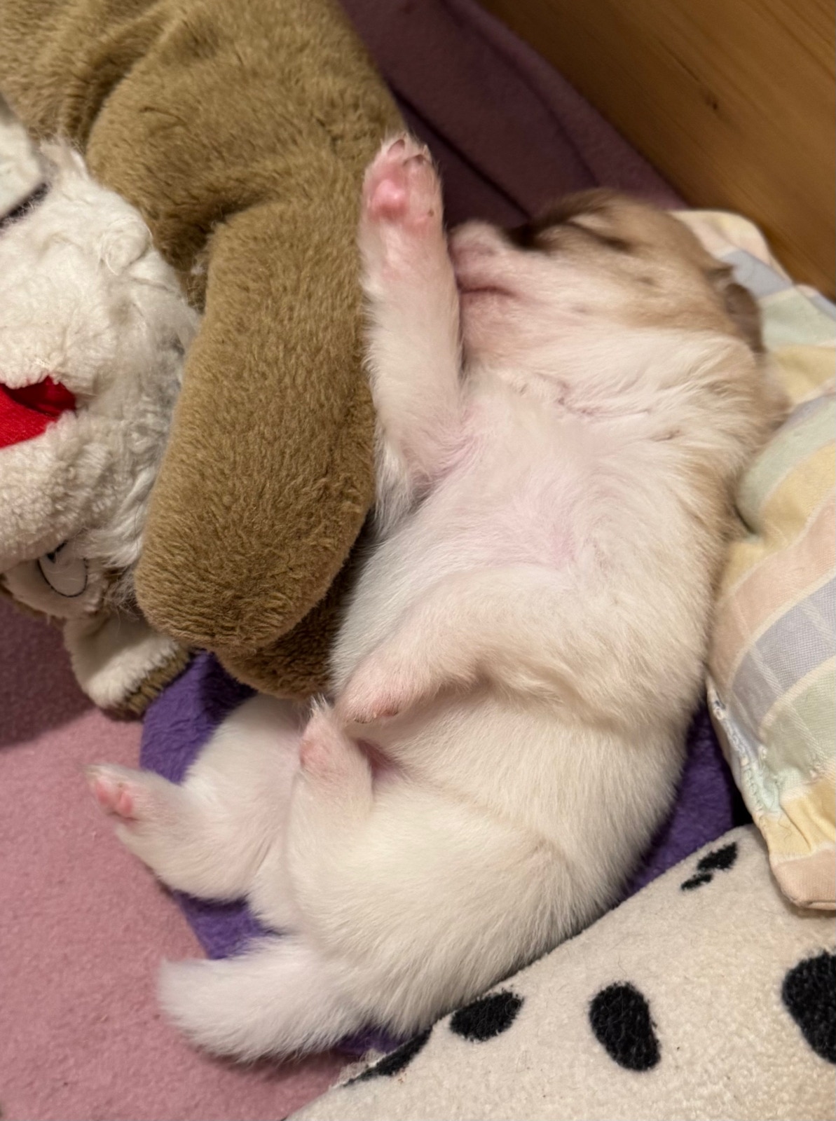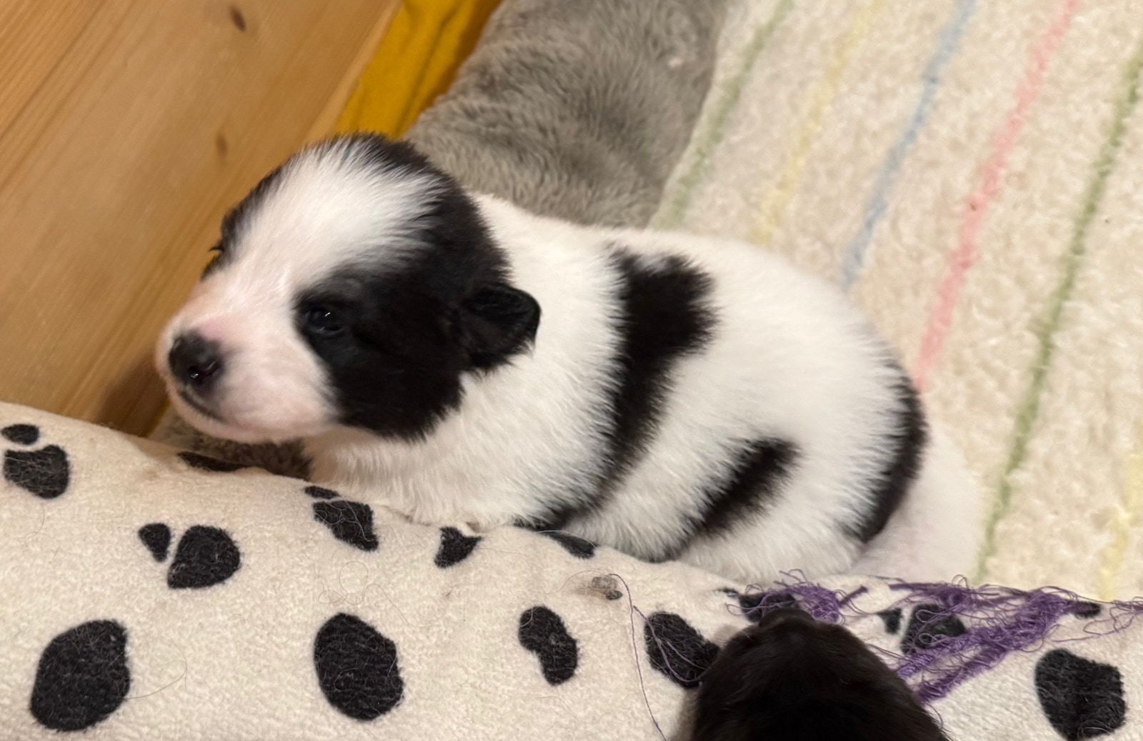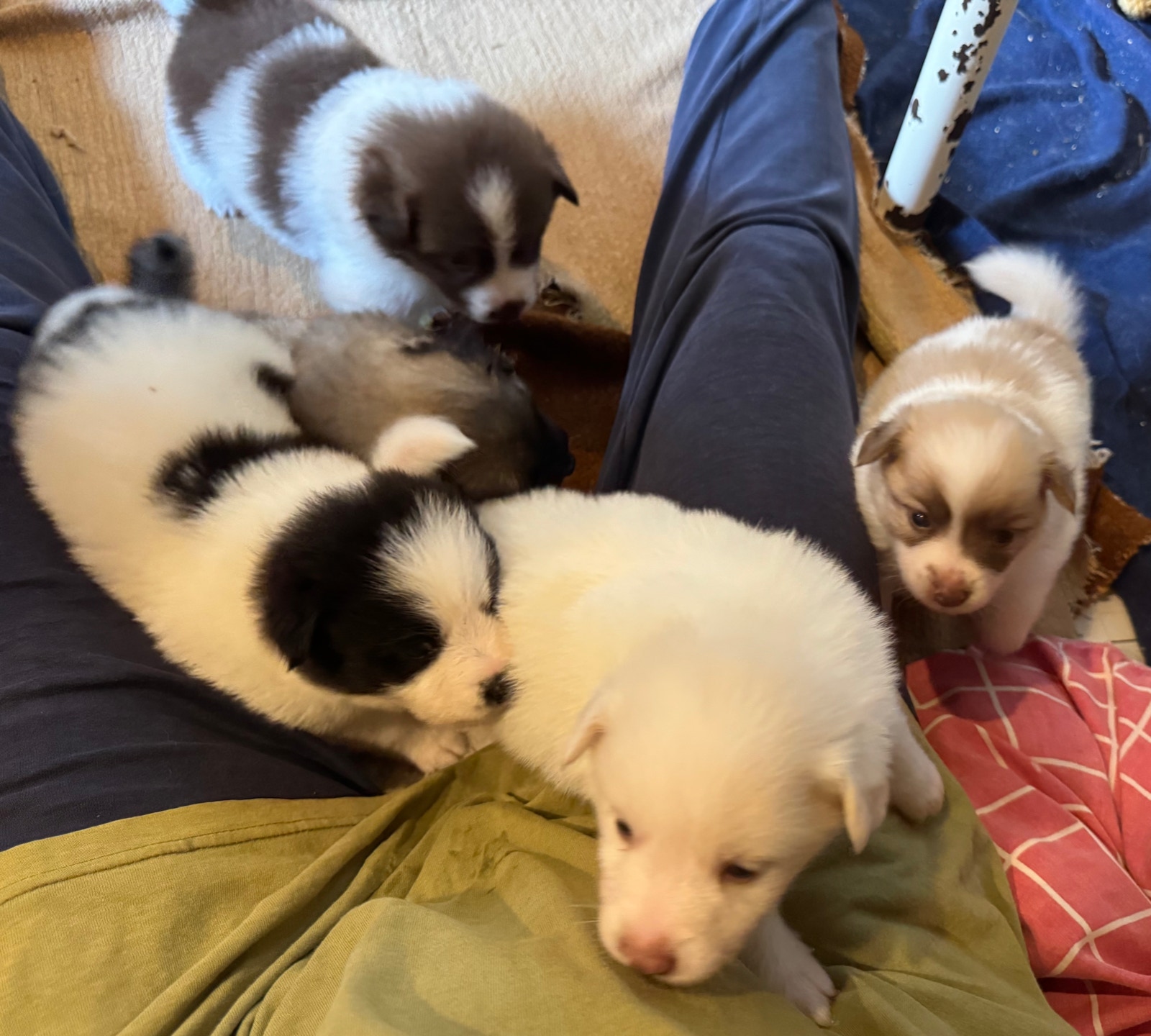Nun sind unsere Neune schon in der 4. Woche und haben ihre erste Wurmkur gut hinter sich gebracht. Jeden Tag gibt es längere Wachphasen, in denen gespielt, agiert oder beobachtet wird und sie sind alle sehr am Menschen interessiert. Sobald sie mit bekommen, das wir sie beobachten oder sie uns hören oder riechen, wollen sie sofort geknuddelt werden und die Ruten werden zu Propellern. Maja springt dann sogar vorwärts, nur um als eine der ersten ganz vorne dabei zu sein, auch sonst ist sie sehr kommunikativ, sie weiß wie sie auf sich aufmerksam machen muss. Es zeigen sich auch die ersten Charakterzüge, wer eher ruhiger und besonnen reagiert oder temperamentvoll nach vorne stürmt, wobei das meist hochkant am Welpengitter oder den Wänden der Wurfkiste endet, das Gemecker danach ist auch nicht zu verachten. Aber noch sind sie einfach bezaubernd und mit ihrem Laut Repertoire einfach lustig, gerade abends sind sie länger munter und dann herrscht ein Fiepen, Bellen, Knurren, Geknöttere und Julen, dass sogar Mama meist das Weite sucht und nur aus der Ferne ihre Bande beobachtet. Ansonsten kümmert sie sich liebevoll und gewissenhaft um ihre Rangen, auch wenn wir nun futtertechnisch unterstützen, denn bei nur 8 Zitzen und 9 Welpen wird es zunehmend schwierig alle ausreichend satt zu bekommen. Aber die Lütten sind da sehr kooperativ, der Milch-Futterbrei wird gerne angenommen und Mama bekommt sogar manchmal noch Reste. Auf jeden Fall ist nach den Mahlzeiten bei ihren Lütten Großreinigung angesagt, denn mit dem „ordentlichen“ Futtern wird es noch etwas dauern, dafür fehlt es nicht am Einsatz und mitten drin macht ja auch satt :-).